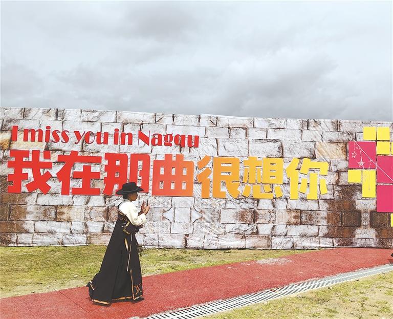 盛裝參加賽馬節(jié)的群眾經過“我在那曲很想你”打卡點。