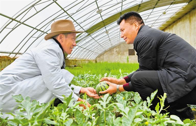 圖為措勤縣農(nóng)牧業(yè)技術(shù)推廣站站長吾金次仁(右)和措勤縣高原生態(tài)畜牧業(yè)現(xiàn)代化養(yǎng)殖一體化產(chǎn)業(yè)綜合基地合作社負(fù)責(zé)人扎西桑布在西瓜大棚里交流。 新華社記者 張汝鋒 攝