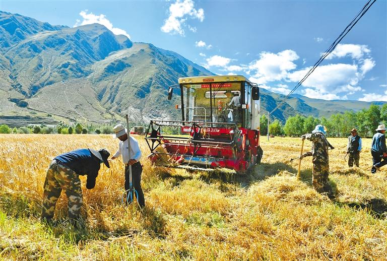 圖為拉薩市達(dá)孜區(qū)塔杰鄉(xiāng)巴嘎雪村村民使用大型機(jī)械進(jìn)行收割。記者 旦增蘭澤 攝