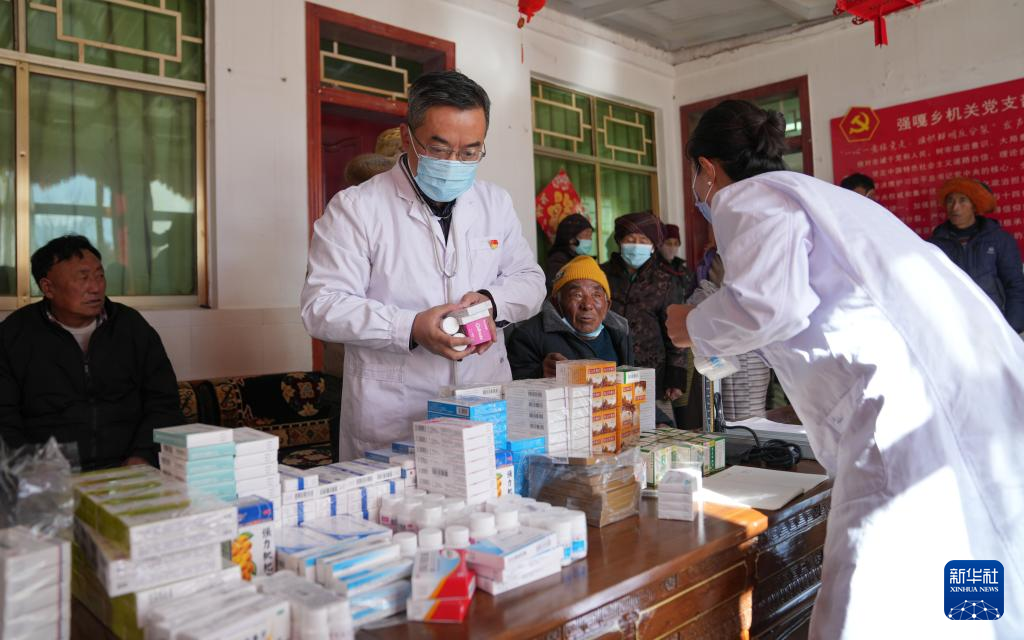 1月24日,西藏大學醫(yī)學院熊海教授給患者發(fā)放藥品。新華社記者 晉美多吉 攝