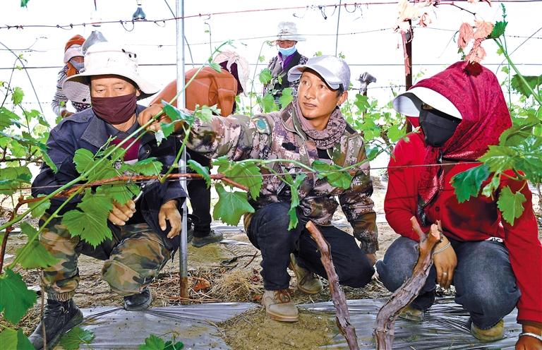 圖為技術員指導群眾為葡萄剪枝。記者 旦增蘭澤 攝