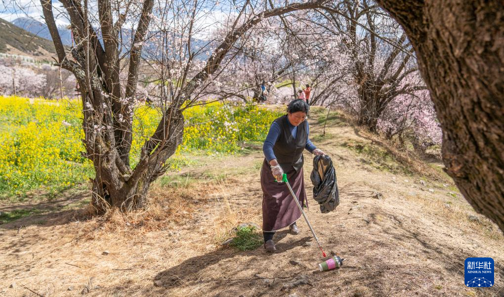 尼瑪曲吉在嘎拉村桃花園里撿拾垃圾。新華社記者丁增尼達 攝