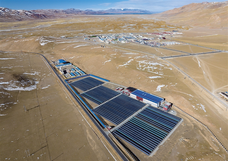 鳥瞰申扎縣城集中供暖項(xiàng)目太陽能集熱場?!⌒氯A社記者 旦增尼瑪曲珠 攝