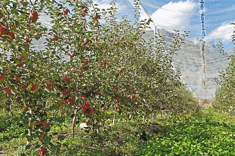 矮砧寬行密植的蘋果樹被劃分成一個個區(qū)域?!斑@是我們的多功能網(wǎng)室,是一種以高密度聚乙烯為主料的防護網(wǎng)。能抗大風,減少冰雹、暴曬等惡劣天氣帶來的影響。”增巴村蘋果種植基地技術員劉傳海介紹道。