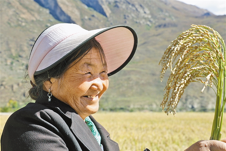 水稻豐收,村民喜笑顏開。記者 卓瑪七林 攝
