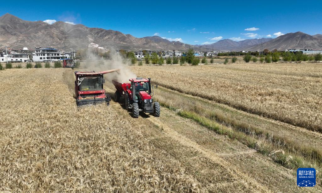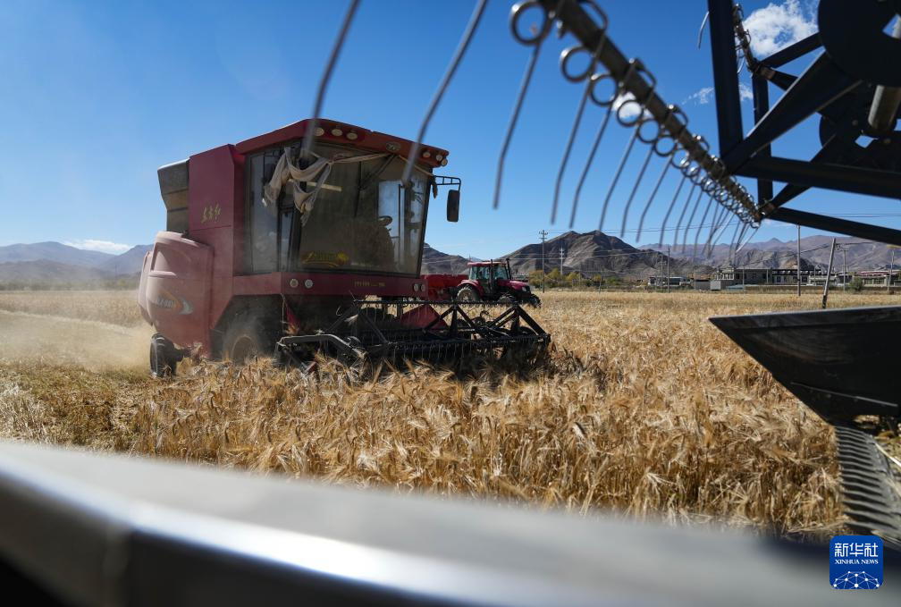 西藏日喀則市江孜縣江熱鄉(xiāng)班覺倫布村農機服務農民專業(yè)合作社的社員使用農機收獲青稞(10月16日攝)。新華社記者 晉美多吉 攝