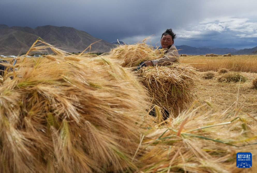 農民在西藏日喀則市年楚河流域的田里收獲成熟的青稞(9月10日攝)。新華社記者 晉美多吉 攝