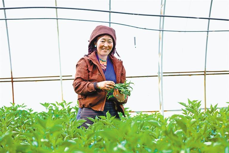 圖為當(dāng)?shù)厝罕娫诖笈飪?nèi)采摘辣椒。記者 格桑倫珠 攝