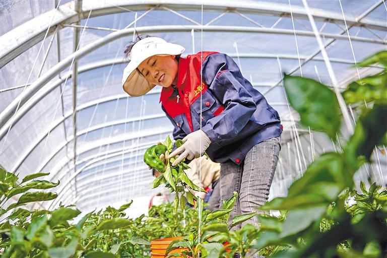 拉薩冬意漸濃,園區(qū)連片的溫室大棚,在冬日暖陽下熠熠生輝,宛如一個個孕育希望的“菜籃子”,豐富冬日市場供應(yīng)。走進蔬菜大棚,棚內(nèi)暖意融融、綠意盎然,黃瓜、西紅柿、青椒等各類蔬菜均已進入成熟期,長勢十分喜人。眼下,正是大棚青椒采摘期,一壟壟、一株株青椒掛滿枝頭,工作人員三五成群忙著采摘,現(xiàn)場一派繁忙景象?!安烧嘟芬蛏险?,這樣才不會損傷植株。”在旦增曲扎的指導(dǎo)下,工作人員很快完成了采摘工作,打包、稱重后,37袋青椒被整齊地擺放在一起,等待著裝車發(fā)貨。