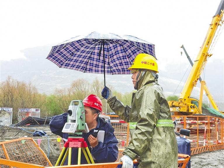 施工人員冒雨工作,搶抓工期。記者 武沛濤 攝