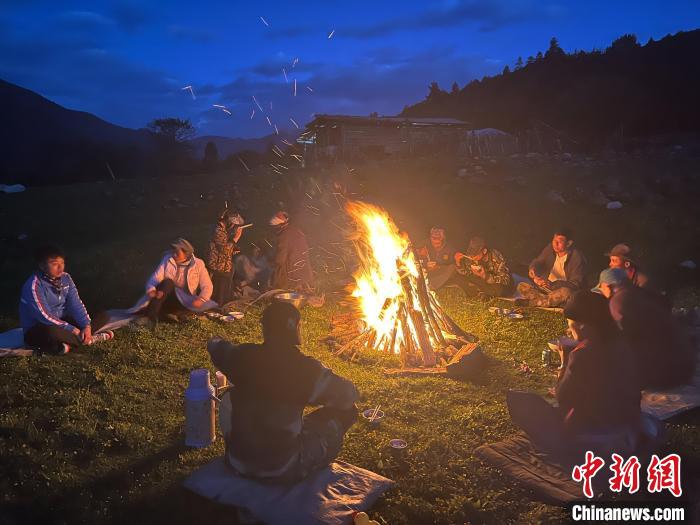 夜幕中,十多位各族男女老少圍坐篝火享用晚餐,暢聊生活。中新網(wǎng)記者 王林 攝