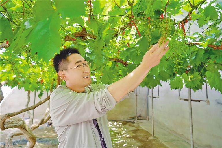 西藏農(nóng)牧科學(xué)院現(xiàn)代化葡萄種植示范基地內(nèi),工作人員正在查看葡萄長勢。