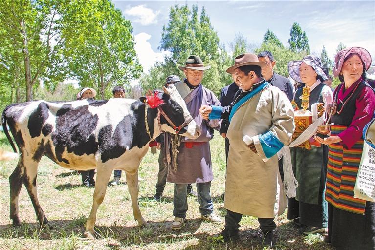 圖為村民手捧青稞酒杯和“切瑪”,迎接優(yōu)質(zhì)奶牛。記者 旦增嘎瓦 攝