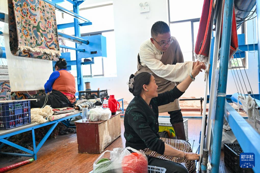 7月18日,江孜藏毯文化發(fā)展有限責任公司的創(chuàng)始人旦增稱來(右上)在生產(chǎn)車間內(nèi)指導員工編織藏毯。新華社記者 李鑫 攝