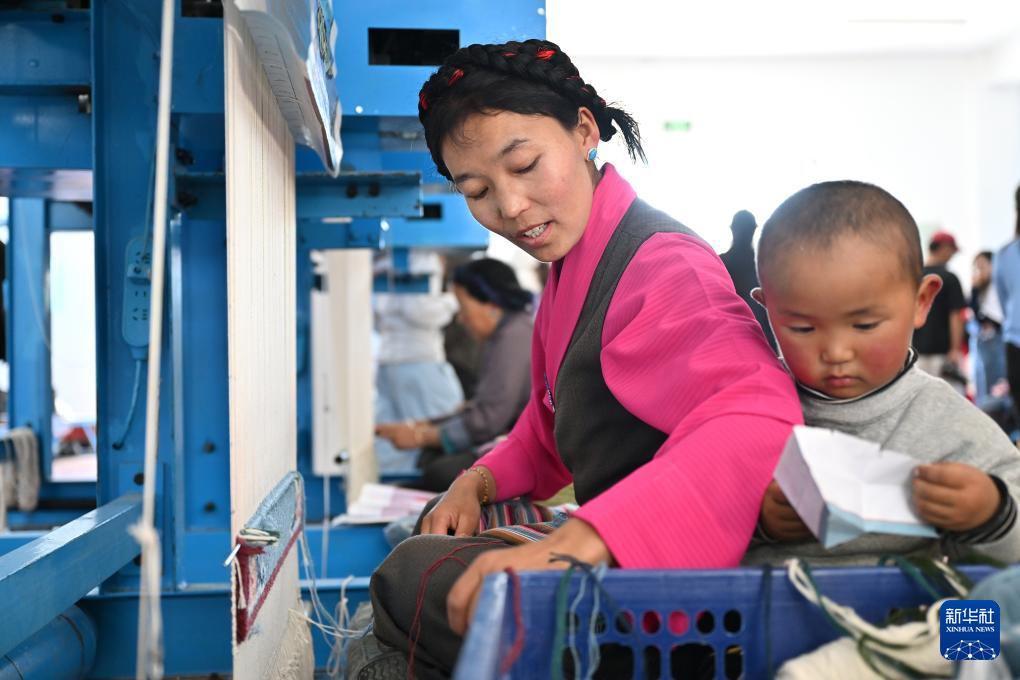 7月18日,江孜藏毯文化發(fā)展有限責任公司的員工次仁卓瑪帶著兒子在生產(chǎn)車間內(nèi)編織藏毯。新華社記者 李鑫 攝