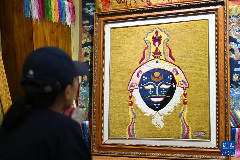 7月18日,一名參觀者在江孜藏毯文化發(fā)展有限責任公司的展示廳內(nèi)觀看藏戲臉譜圖樣的藏毯產(chǎn)品。新華社記者 李鑫 攝