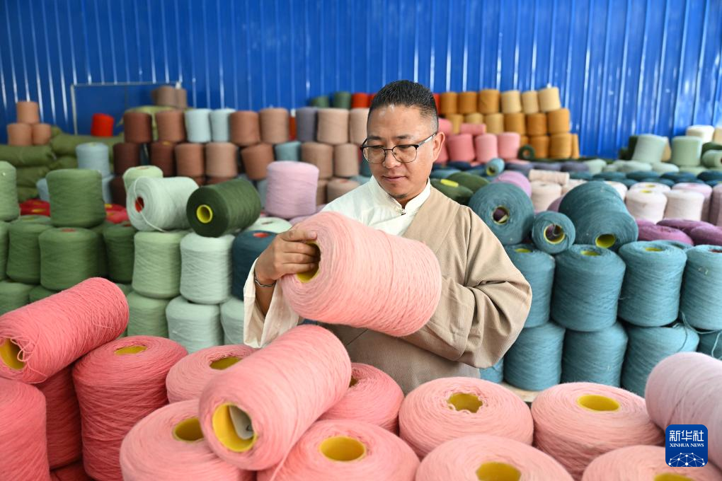 7月18日,江孜藏毯文化發(fā)展有限責任公司創(chuàng)始人旦增稱來在倉庫里檢查染色后的紗線。新華社記者 李鑫 攝