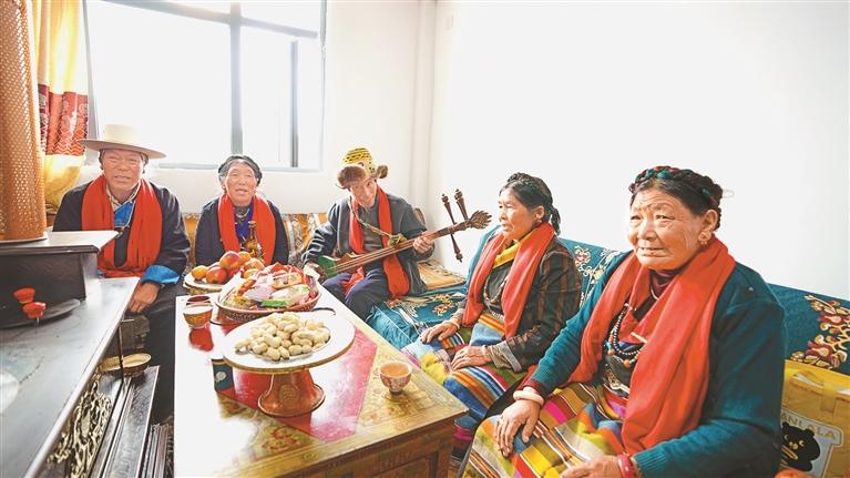 拉孜縣熱薩鄉(xiāng)強(qiáng)公村群眾在新居內(nèi)共度重陽佳節(jié)。記者 旦增嘎瓦 攝