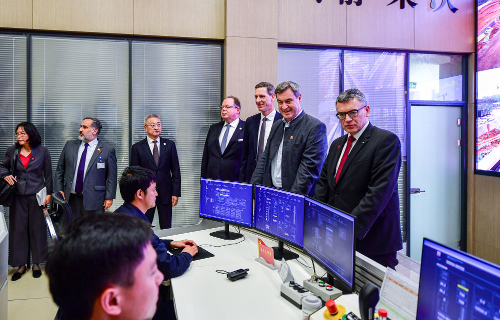德國巴伐利亞州州長索德爾(右二)一行來到中德合作的磁懸浮成都試驗線列車運(yùn)控中心參觀。新華社記者張超群攝