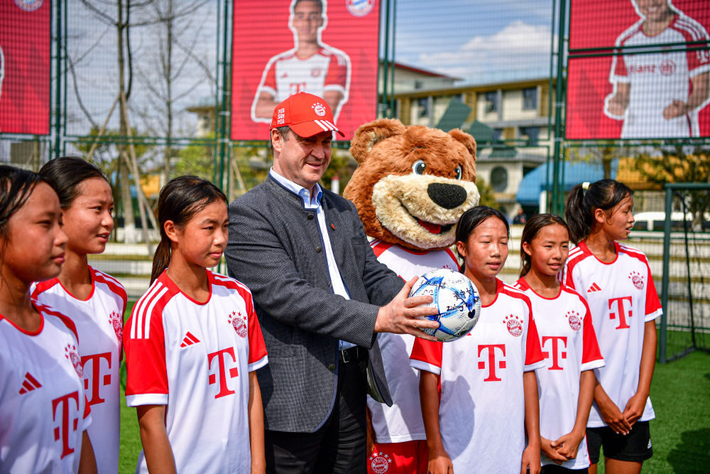 德國巴伐利亞州州長索德爾(左四)在位于成都市武侯區(qū)的阿迪達(dá)斯20號體育公園觀摩了一場中國少年女子足球隊的訓(xùn)練賽。新華社記者張超群攝