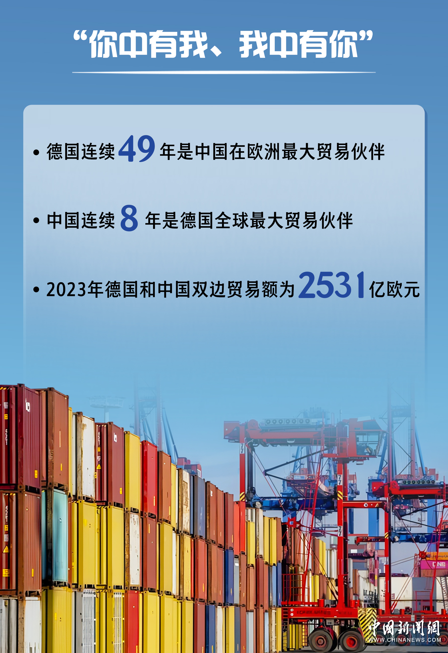 根據(jù)德國(guó)聯(lián)邦統(tǒng)計(jì)局?jǐn)?shù)據(jù),2023年德國(guó)和中國(guó)雙邊貿(mào)易額為2531億歐元,中國(guó)已連續(xù)8年成為德國(guó)全球最大貿(mào)易伙伴。德國(guó)連續(xù)49年是中國(guó)在歐洲最大貿(mào)易伙伴。