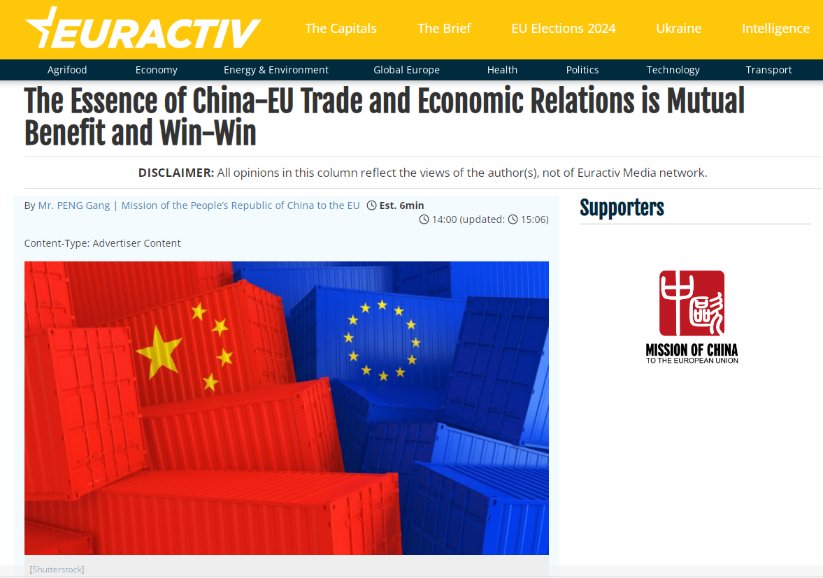 △中國駐歐盟使團(tuán)公使彭剛發(fā)題為《中歐經(jīng)貿(mào)關(guān)系的本質(zhì)是互利共贏》的署名文章