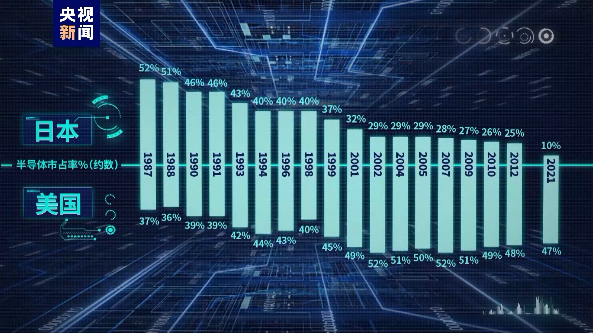 當(dāng)我們在AI數(shù)據(jù)庫中搜索全球半導(dǎo)體產(chǎn)業(yè)的發(fā)展趨勢,系統(tǒng)為我們生成了這樣一張圖。以1987年為分界線,日本半導(dǎo)體產(chǎn)業(yè)進(jìn)入消沉的30年,美國卻開始迅速崛起,最終重新實現(xiàn)壟斷。