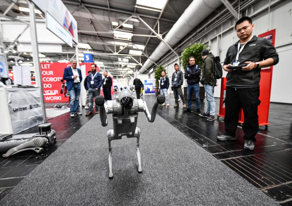 4月22日,在德國漢諾威工博會(huì)上,杭州宇樹科技有限公司參展商(右一)在展示一款機(jī)器狗。新華社記者任鵬飛攝