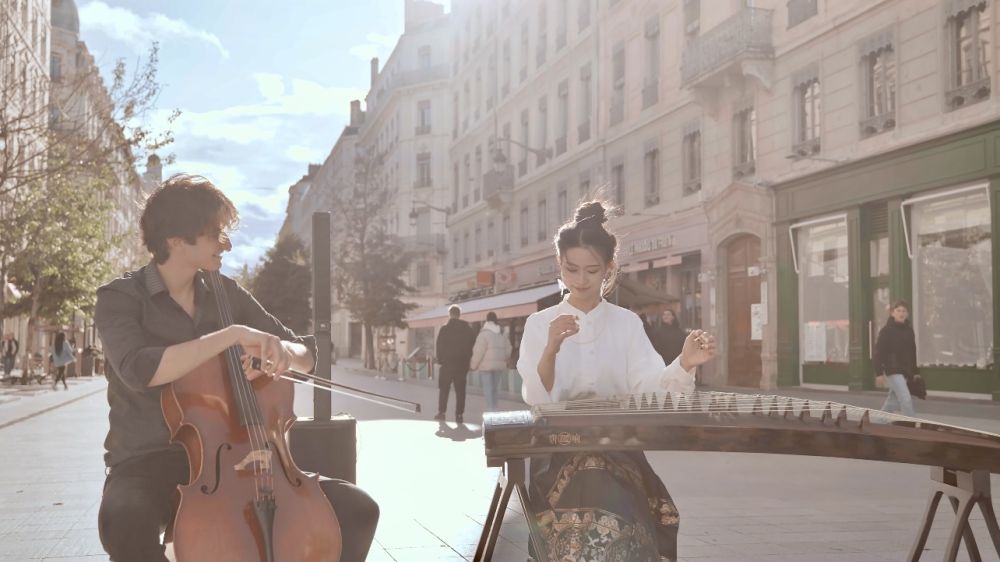 在彭靜旋的視頻中,有一個在法國尼斯與街頭鋼琴藝術(shù)家的合作作品,被網(wǎng)友親切地形容為“兩琴相悅”“琴箏意切”。