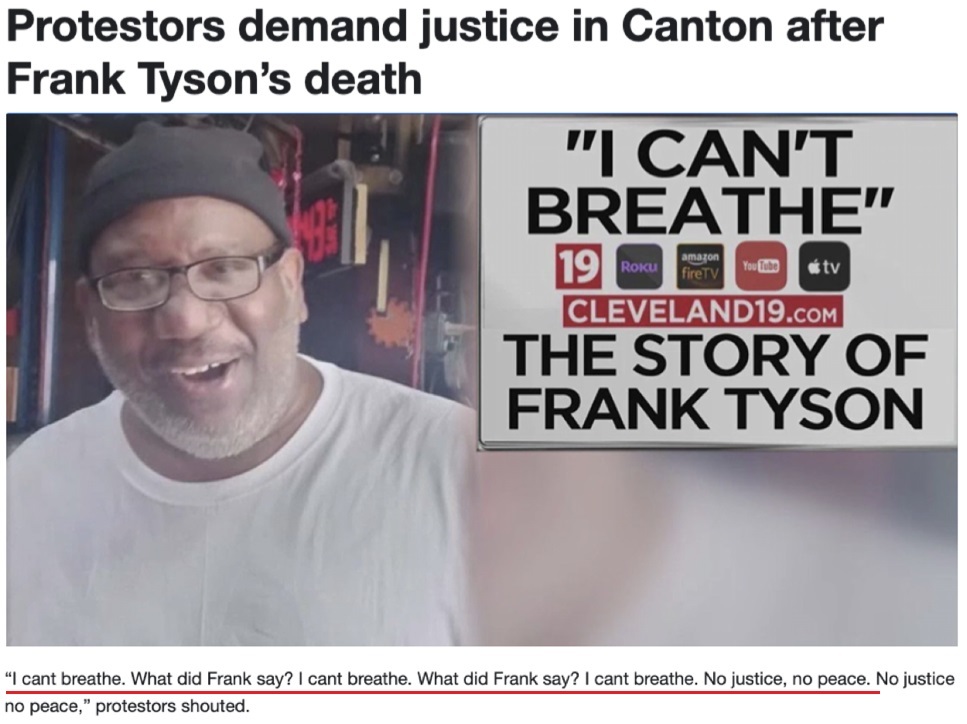 當(dāng)?shù)貢r間5日,美國俄亥俄州坎頓市的一個球場外,憤怒的抗議人群反復(fù)高呼這句話,強(qiáng)烈要求為日前遭白人警察“跪殺”的非洲裔男子弗蘭克·泰森伸張正義。
