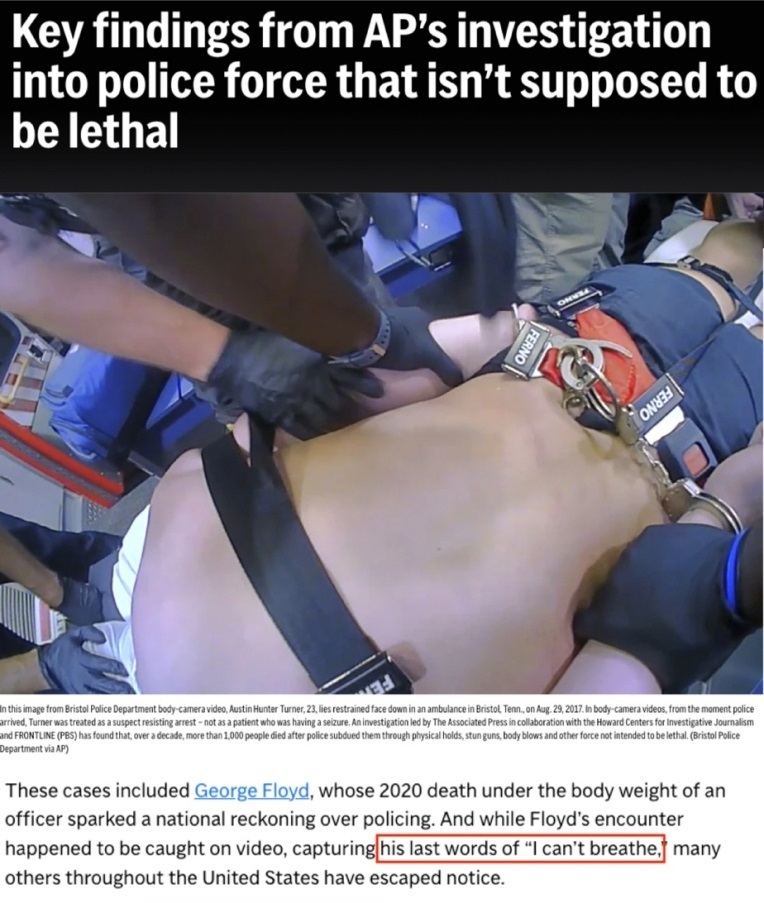 美聯(lián)社不久前主導(dǎo)的一項(xiàng)調(diào)查發(fā)現(xiàn),在2012年至2021年的十年間,美國警察使用身體約束、電擊、毆打等所謂“非致命性手段”導(dǎo)致至少1036人死亡,平均每周兩人。