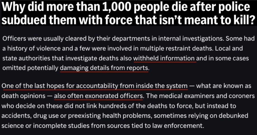 而作為內(nèi)部問責(zé)的最后希望之一,法醫(yī)和驗(yàn)尸官提供的所謂“死亡意見”也經(jīng)常為警察開脫,一些明顯與警察暴力執(zhí)法相關(guān)的死亡,會被他們歸因于事故、吸毒或先前存在的健康問題。