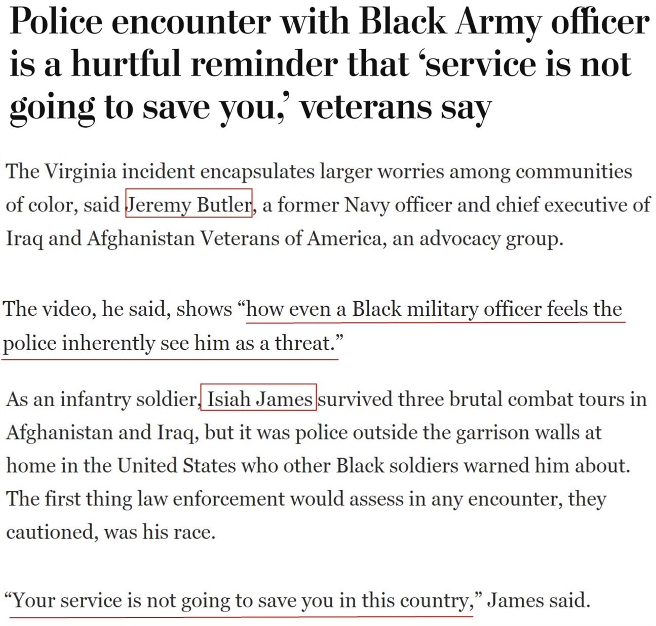 在美國(guó)伊拉克和阿富汗退役軍人協(xié)會(huì)首席執(zhí)行官杰里米·巴特勒看來(lái),納扎里奧事件表明,“即使是一名非裔軍官也會(huì)覺(jué)得,美國(guó)警察天生就把他視為一種威脅”。