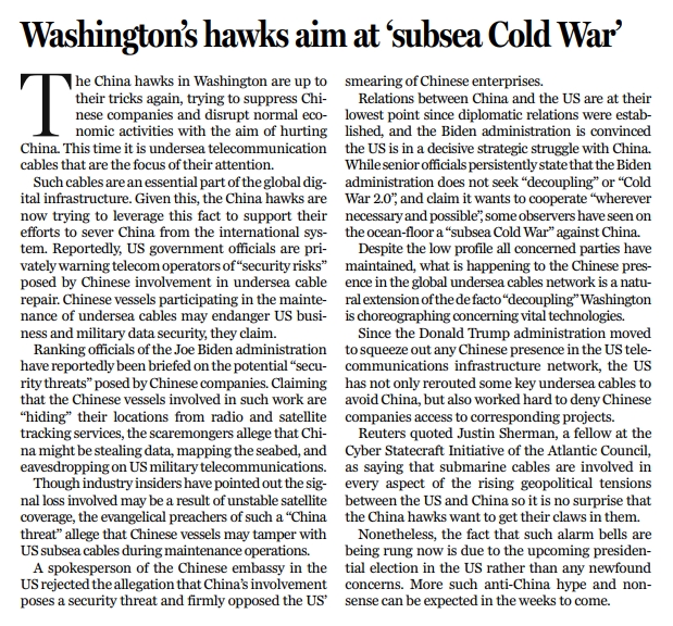 海底光纜是全球數(shù)字基礎設施的基礎組成部分。對華鷹派們正利用這一點大做文章,為自己試圖把中國從全球體系中分離的行徑找理由。據(jù)報美國政府一些官員已私下向電信運營商們發(fā)出警告,稱讓中國參與海底光纜維修可能會引發(fā)“安全風險”,并稱參與海底光纜維護的中國船只可能“危及美國商業(yè)和軍事數(shù)據(jù)安全”。