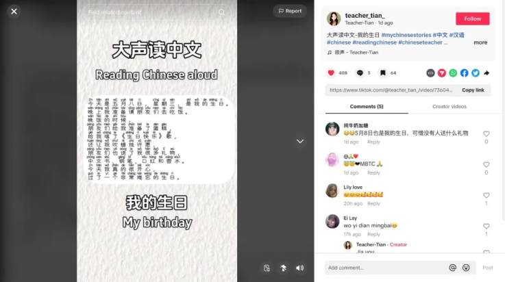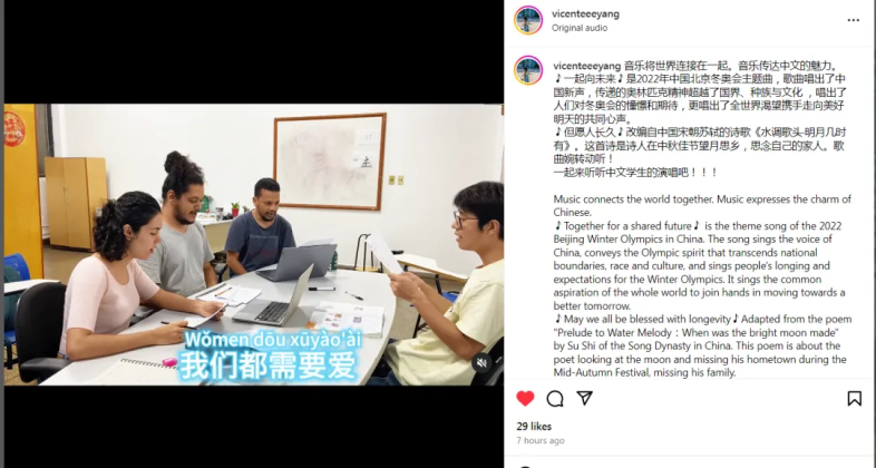 來自老撾的楊世群、菲律賓的黃玉潔、布隆迪的田曉慧和墨西哥的楊衍輝等老師,還分享了各種學習中文的有趣方法,例如情景演繹、唱歌學中文、跟讀練習,獲得了網友們的一致好評。