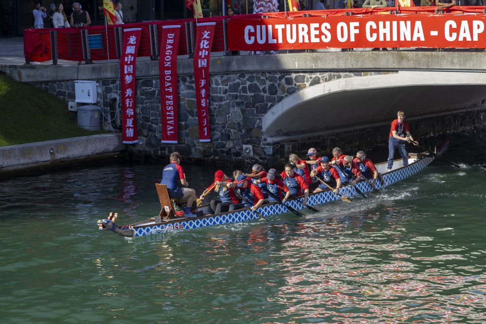 6月8日,人們?cè)谀戏情_(kāi)普敦參加第二屆“文化中國(guó)·開(kāi)普敦龍舟節(jié)”比賽。新華社記者王雷攝