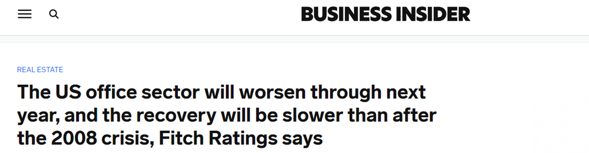 惠譽(yù)稱:“與2008年全球金融危機(jī)之后相比,此輪周期中寫字樓行業(yè)的復(fù)蘇將更加緩慢、耗時(shí),并將導(dǎo)致美國(guó)房地產(chǎn)價(jià)值永久性受損、業(yè)績(jī)表現(xiàn)疲軟以及貸款損失增加。”