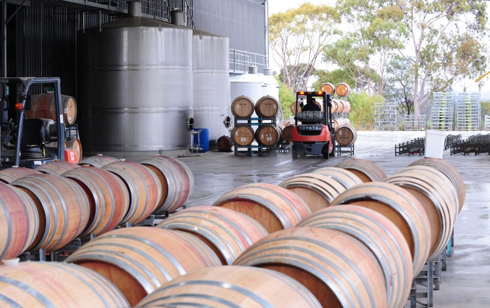 ↑5月30日,在澳大利亞巴羅薩谷,特思納酒莊員工在倉庫搬運(yùn)葡萄酒桶。