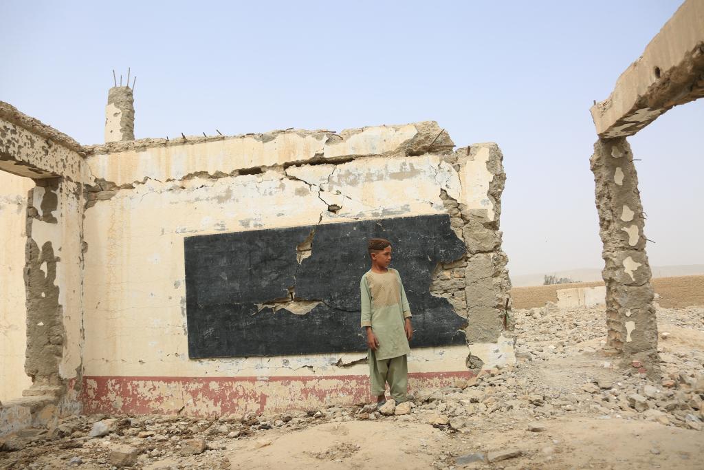 2022年8月23日,在阿富汗南部赫爾曼德省桑金地區(qū),一名男孩站在廢墟之中。桑金地區(qū)曾經(jīng)最繁華的市場(chǎng),如今遍布美軍空襲留下的一個(gè)個(gè)巨大彈坑。新華社發(fā)(塞夫拉赫曼·薩菲攝)