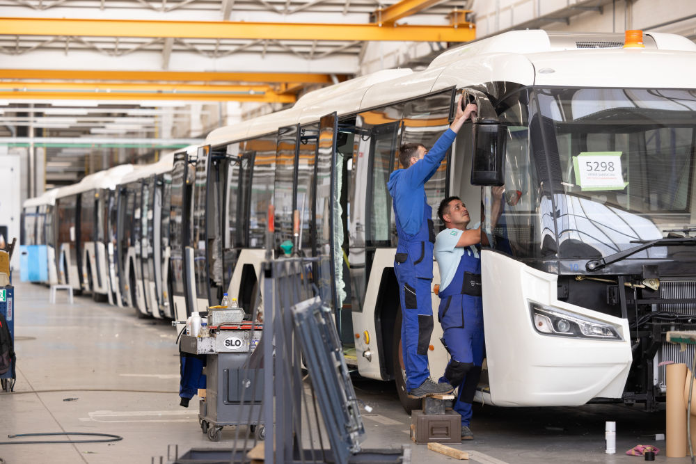 6月14日,在斯洛文尼亞馬里博爾郊區(qū)的TAM歐洲商用車研發(fā)制造公司工廠,工人在電動(dòng)巴士生產(chǎn)線上工作。新華社發(fā)(澤利科·斯特凡尼奇攝)