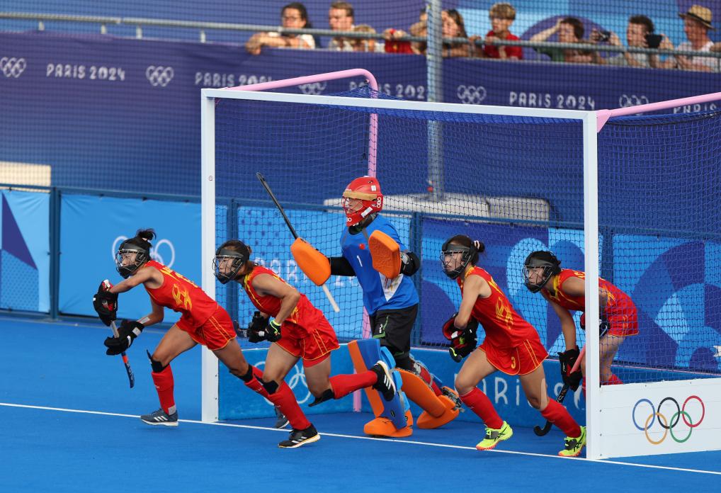 8月7日,中國女子曲棍球隊球員在比賽中防守短角球。新華社記者 任鵬飛 攝