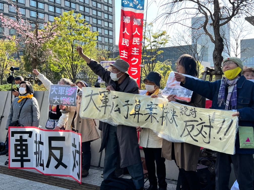 2023年3月28日,在日本東京,民眾在參議院議員會(huì)館前舉行抗議活動(dòng),反對(duì)參議院當(dāng)天通過“軍備擴(kuò)張預(yù)算”案。新華社記者姜俏梅攝