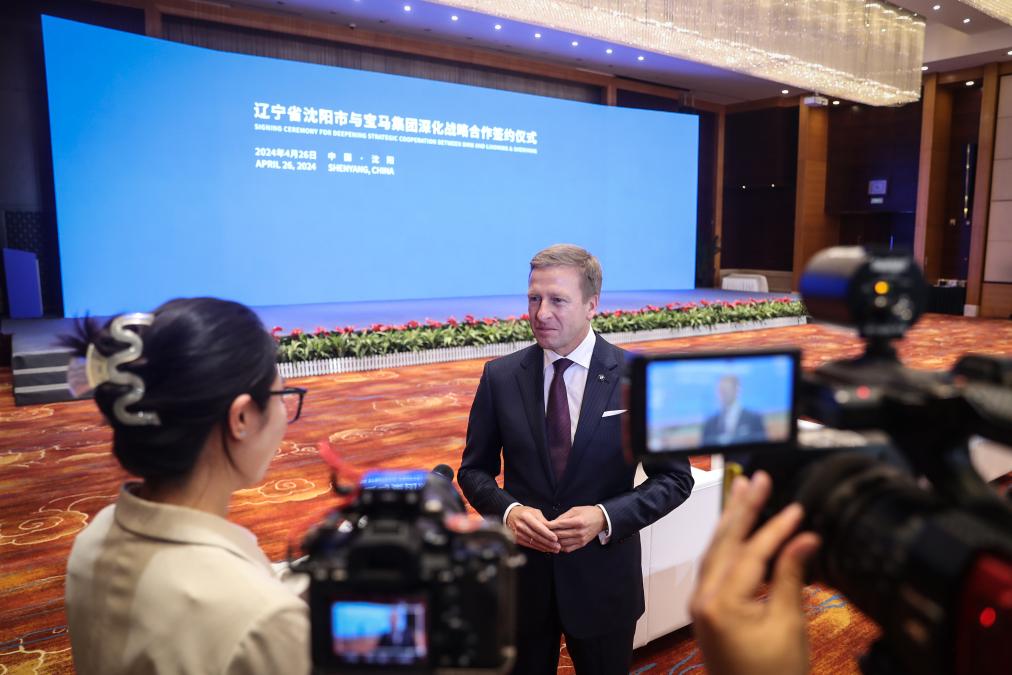 2024年4月26日,寶馬集團(tuán)董事長(zhǎng)齊普策在遼寧省沈陽(yáng)市與寶馬集團(tuán)深化戰(zhàn)略合作簽約儀式現(xiàn)場(chǎng)接受采訪(fǎng)。新華社記者潘昱龍攝