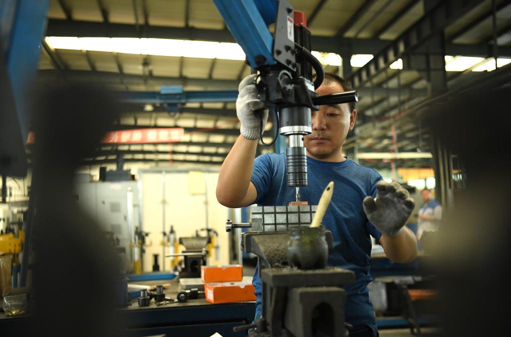 2024年7月30日,在長(zhǎng)春吉林通用機(jī)械(集團(tuán))有限責(zé)任公司模具裝配生產(chǎn)線(xiàn),鉗工在進(jìn)行攻絲操作。近年來(lái),吉林通用機(jī)械(集團(tuán))有限責(zé)任公司通過(guò)數(shù)字化改造、智能化升級(jí)提高生產(chǎn)效率,提升產(chǎn)業(yè)競(jìng)爭(zhēng)力,已成為全球鋁加工汽車(chē)輕量化零部件知名供應(yīng)商,為奧迪、大眾、寶馬、奔馳、保時(shí)捷等多家品牌主機(jī)廠(chǎng)供應(yīng)零件。新華社記者柳文惠攝