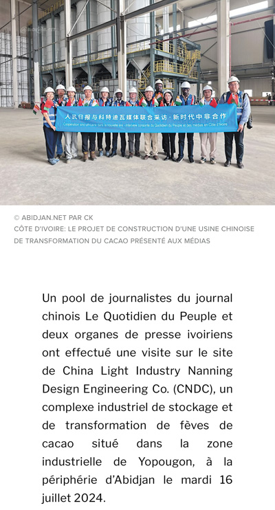 7月16日,人民日?qǐng)?bào)與兩家科特迪瓦新聞機(jī)構(gòu)記者一行參觀了由中國輕工業(yè)南寧設(shè)計(jì)工程有限公司總承包的可可加工及可可豆倉庫建設(shè)項(xiàng)目,該項(xiàng)目坐落在阿比讓郊區(qū)的約普貢工業(yè)區(qū)。
