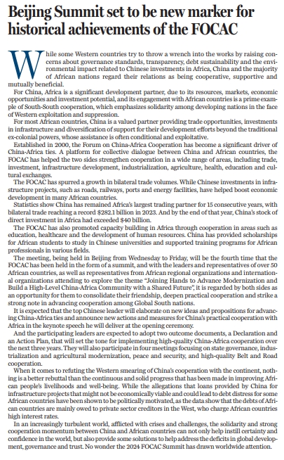 面對危機與挑戰(zhàn)增多、動蕩不安的當今世界,中國與非洲國家間展現(xiàn)的團結(jié)一致與強勁合作勢頭,不僅可以為世界注入更多確定性和信心,也可以為解決全球發(fā)展、治理和信任赤字提供方案。鑒于此,2024中非合作論壇峰會自然是全球矚目的焦點。