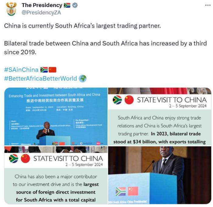 南非總統(tǒng)官方賬號也在峰會期間發(fā)文稱,中國目前是南非最大的貿(mào)易伙伴,南非和中國擁有充滿活力、多元和不斷增長的經(jīng)濟(jì),能夠?yàn)橄M_拓新市場的企業(yè)提供豐富機(jī)遇。