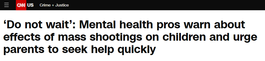 薩爾茲和羅辛-斯萊特都警告表示,(美國社會)急需對校園槍擊事件或一般槍支暴力事件中幸存的兒童及青少年出現(xiàn)的心理健康問題作出反應(yīng),這對保護(hù)他們的未來至關(guān)重要。