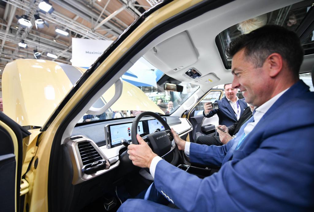 9月16日,在德國漢諾威國際交通運(yùn)輸博覽會媒體預(yù)展上,一名男子體驗上汽大通eTerron 9純電皮卡車。新華社記者任鵬飛攝