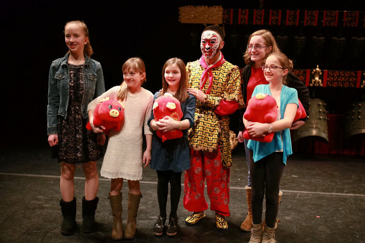 2019年2月14日,在美國馬斯卡廷,當?shù)赜^眾在演出結束后與扮演孫悟空的中國國家京劇院演員合影。當晚,由湖北省歌劇舞劇院編鐘國樂團和中國國家京劇院一團的藝術家們聯(lián)袂奉獻的“歡樂春節(jié)”大戲在這里上演。新華社記者 汪平 攝